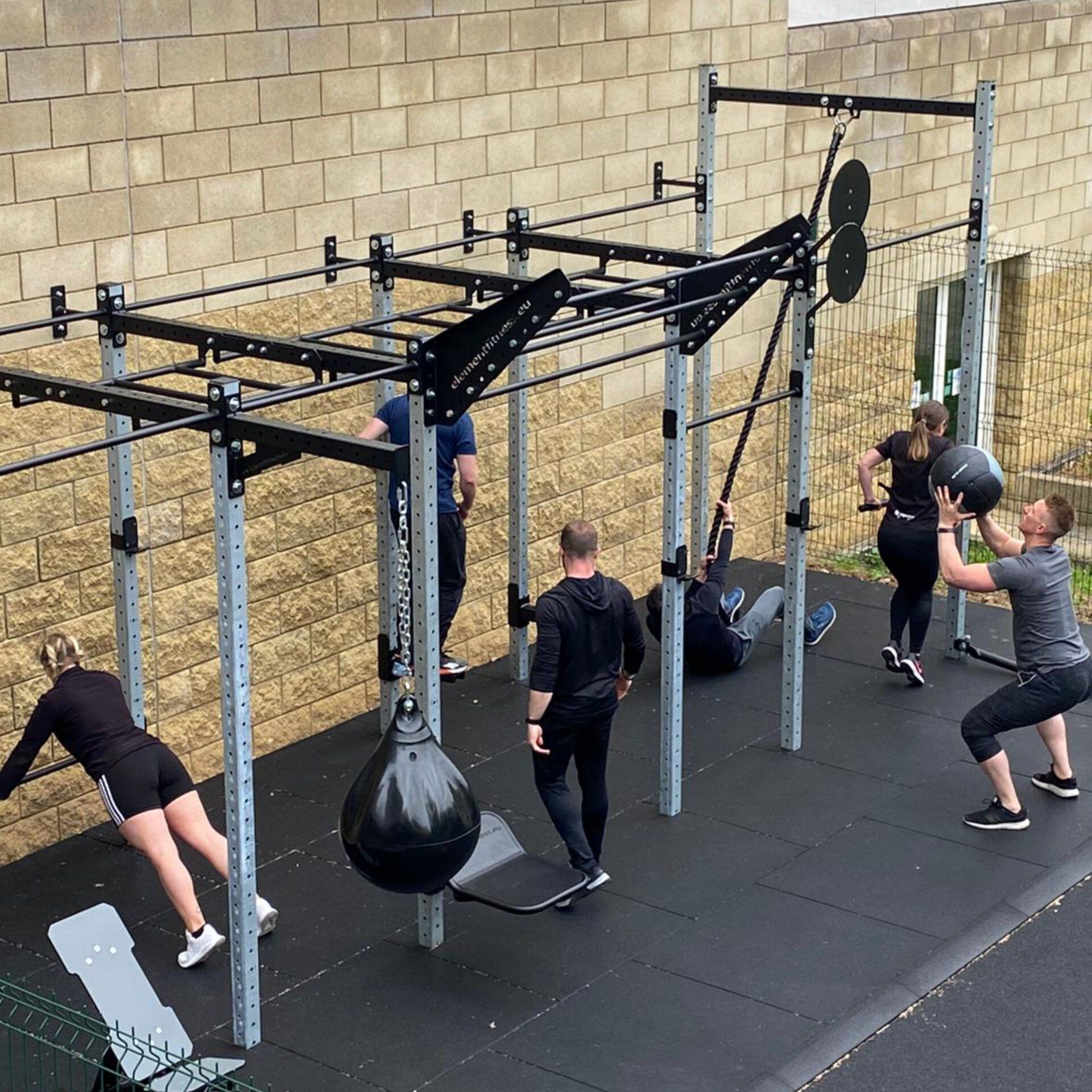The 8m outdoor rig was secured to the wall and the floor and included a 3.4m rope climb, 3.4m cargo net, 4 lifting stations, multiple pull up bars including twin adjustable pull up bars, monkey bars, fixed grappler, battle rope attachment, double wall ball target, 3 bar wing, boxing bag arm complete with 190lb Aqua Punching Bag, safety squat attachments, dipping station and jump platform.